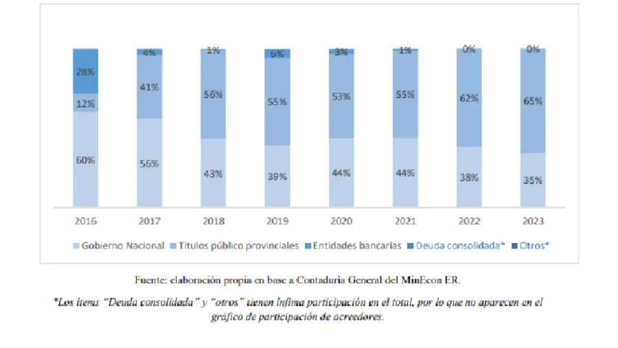 “Si bien el monto se incrementó un 280% respecto al 2022, dado que la de inflación el año 2023 fue de 211,4%, en términos reales lo hizo en un 22%. Del total adeudado, $382 mil millones (65%) son títulos públicos, $202 mil millones son con el Estado nacional (35%), y $52 millones (0,01%) es con bancos privados y deuda consolidada”, se precisó.