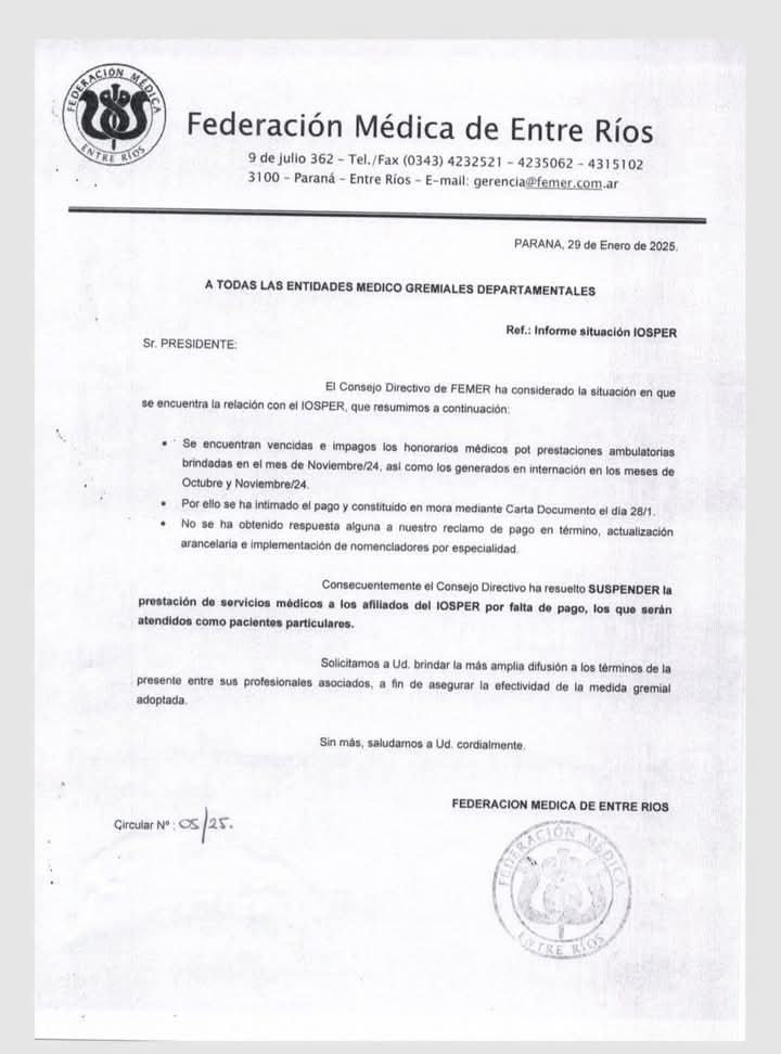 En una nota dirigida a todas las entidades médico gremiales departamentales, el Consejo Directivo de Federación Médica de Entre Ríos (FEMER) informó que "considerando la situación en que se encuentra la relación con la Obra Social provincial" resolvió “suspender la prestación de servicios médicos a los afiliados del IOSPER por falta de pago, los que serán atendidos como pacientes particulares”.