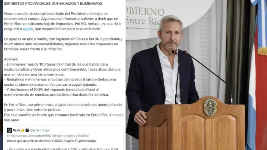 “Hace unos días destaqué la decisión del Presidente de bajar las retenciones al campo. Algunos desinformados salieron a decir que en Entre Ríos no habíamos bajado impuestos. FALSO”, escribió Frigerio, al tiempo que destacó que incluso una consulta hecha al asistente virtual Grok fue respondida correctamente, aunque “se quedó corto”.