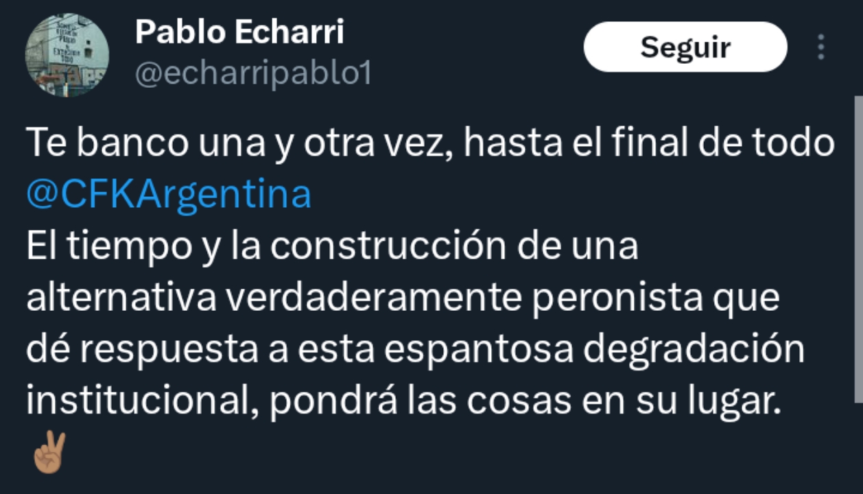 A través de un mensaje en sus redes sociales, Echarri, conocido por su apoyo al kirchnerismo, manifestó: "Te banco una y otra vez, hasta el final de todo". El actor acompañó el mensaje con el icónico símbolo de paz, dejando claro su apoyo a la figura de la ex mandataria.