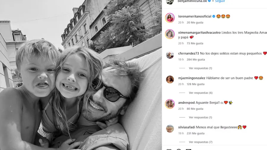 En una fotografía en blanco y negro, se los puede ver a los tres sonriendo con complicidad, disfrutando del aire libre y del verano. La postal rápidamente se viralizó y generó una ola de reacciones entre sus más de tres millones de seguidores, quienes elogiaron el encuentro que tuvo con sus hijos más chicos con comentarios como “Hablame de ser buen padre”, “Aguante Benja” y “Un poco de paz para estos bellos nenes”.