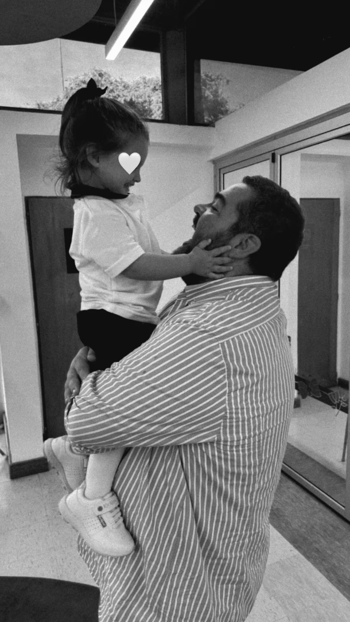 En una de las fotografías, se lo ve sosteniendo a la pequeña en alto, ambos cara a cara, con una sonrisa que desborda ternura. En otra, la imagen se vuelve casi cinematográfica: padre e hija de espaldas, ella sobre sus hombros, en un instante que resume protección, amor y un futuro por descubrir.
