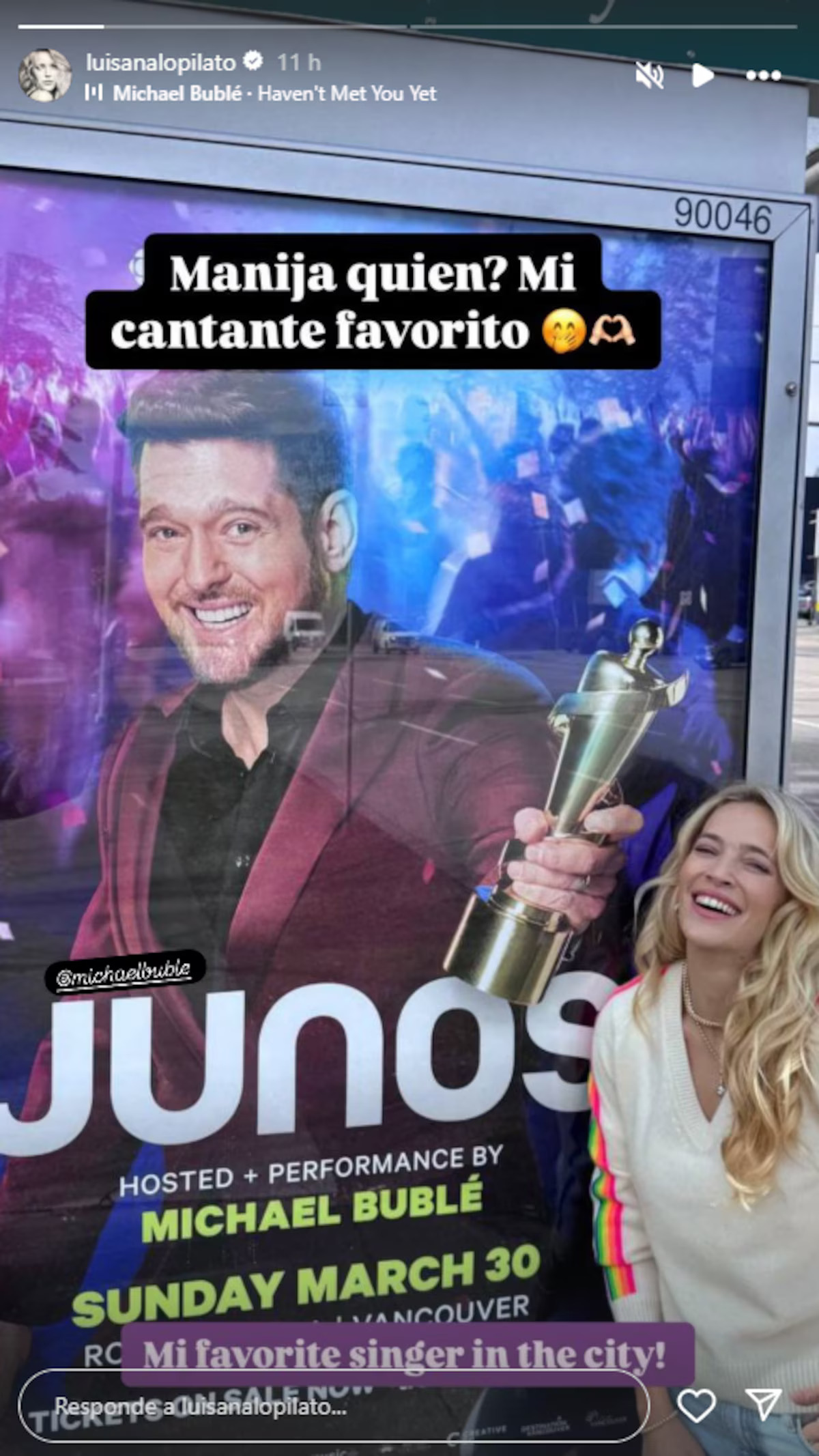 La actriz argentina, que reside en Canadá junto al cantante y sus hijos, no dudó en compartir su entusiasmo al ver un cartel promocional de los Juno Awards 2025, evento en el que Bublé será anfitrión y dará un show especial el próximo 30 de marzo en el Rogers Arena de Vancouver. Orgullosa de los proyectos laborales y logros de su marido, Luisana no dejó pasar la oportunidad de protagonizar una desopilante escena que se volvió viral entre los internautas.