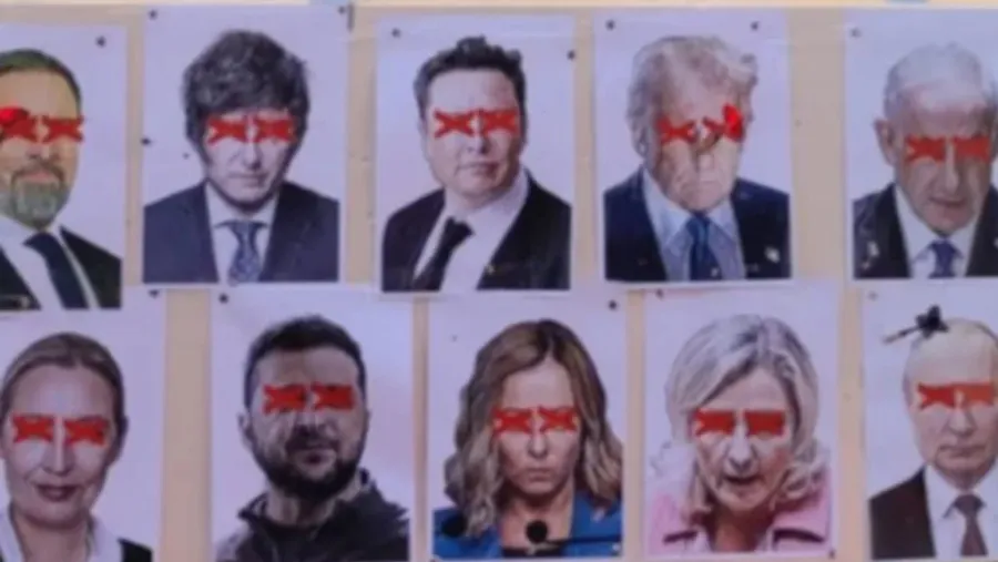 También aparecían otros líderes como Giorgia Meloni, Santiago Abascal, Alice Weidel, Marine Le Pen y el empresario Elon Musk, todos con sus rostros tachados en señal de rechazo, refleja el sitio Newsweek Argentina.