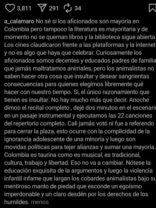 Un día después, el cantante dejó un posteo en sus redes sociales: “Curiosamente los aficionados somos decentes y educados padres de familia que jamás maltratamos animales, pero los animalistas no saben hacer otra cosa que insultar y desear sangrientas consecuencias para quienes elegimos libremente qué hacer con nuestro tiempo. Si, en único razonamiento que tienen es insultar. No hay mucho más que decir”.