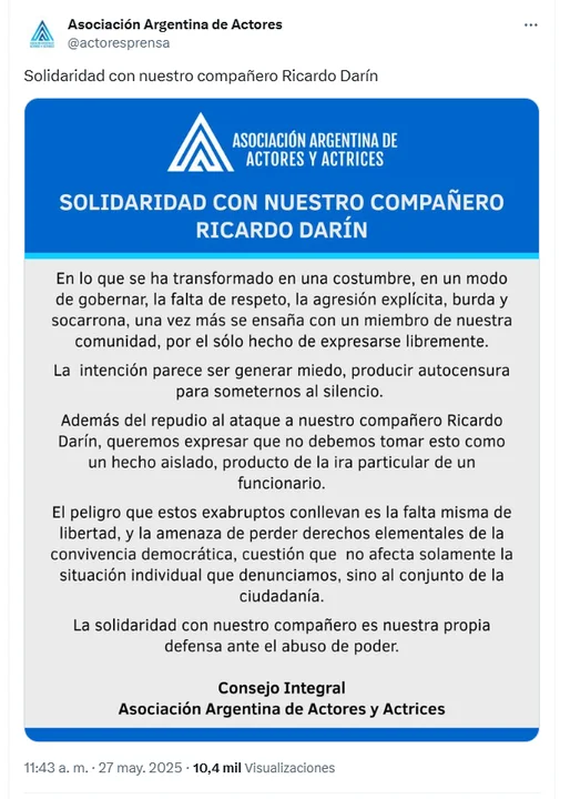 En respuesta, la Asociación de Actores remarcó que “la solidaridad con nuestro compañero es nuestra propia defensa ante el abuso de poder”, y advirtió que estos episodios representan un riesgo para la convivencia democrática y la libertad de expresión.