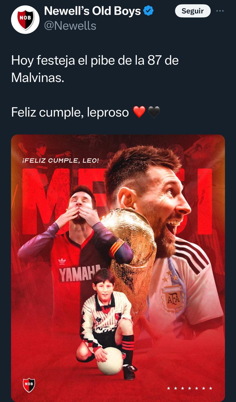El primero de ellos en saludarlo fue Newell´s, equipo del que es hincha el astro rosarino, catalogado por muchos como el mejor jugador de la historia. “Hoy festeja el pibe de la 87 de Malvinas. Feliz cumple, leproso”, fue el mensaje que compartieron en sus redes sociales.