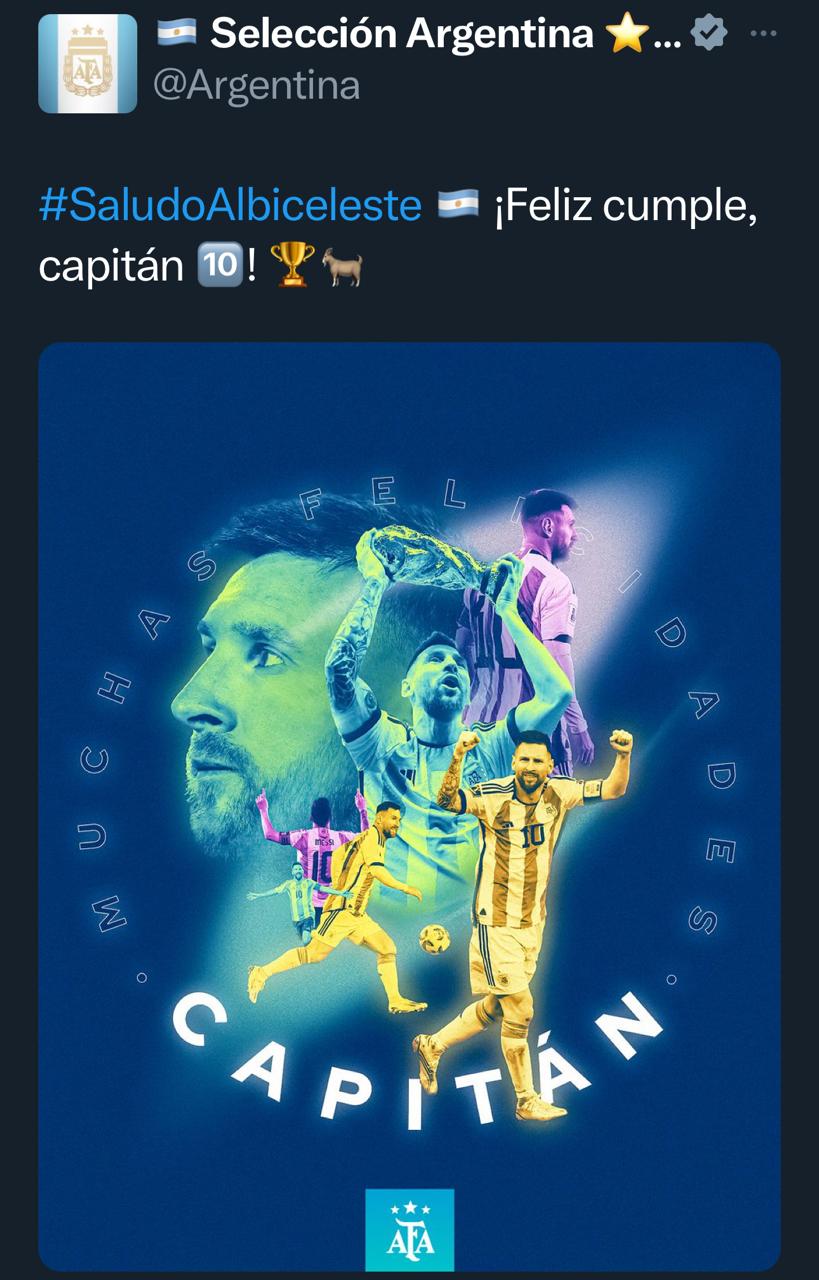 Finalmente, la Selección argentina le puso “¡Feliz cumpleaños, capitán!”, junto al hashtag #SaludoAlbiceleste.