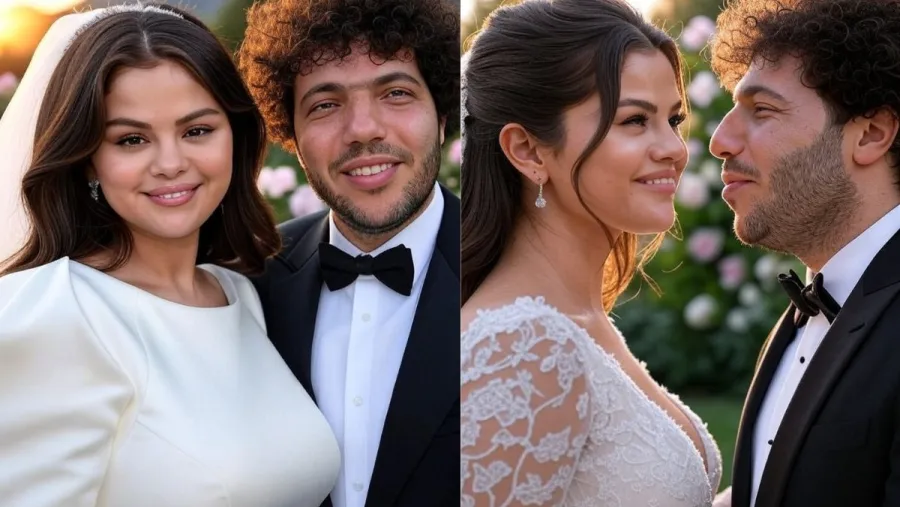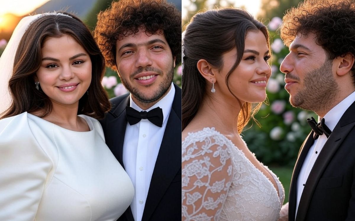 Para la ocasión, la cantante de Who Says, de 33 años, eligió un vestido de satén con cuello halter y detalles de encaje, acompañado por un ramo de flores blancas de gipsófilas. Benny, de 37 años, lució un esmoquin negro clásico, camisa blanca y sutiles detalles en encaje que acompañaban el look de su flamante esposa.