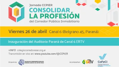 Organizan la Jornada “Consolidar la profesión del Corredor Público Inmobiliario” El Colegio de Corredores Públicos Inmobiliarios de Entre Ríos organiza la Jornada “Consolidar la profesión del Corredor Público Inmobiliario”. Se llevará a cabo el viernes 26 de abril, en Paraná. Coincidentemente, tendrá lugar la inauguración del Auditorio Paraná de
