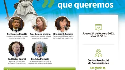 Jornada sobre fortalecimiento del Poder Judicial Bajo el lema “Hacia La Justicia que queremos”, se realizará en Paraná una Jornada de fortalecimiento del Poder Judicial. Será el próximo jueves, a partir de las 18.30, en el Centro Provincial de Convenciones (San Martín 15) y tendrá como principal orador al presidente de la Corte Suprema de